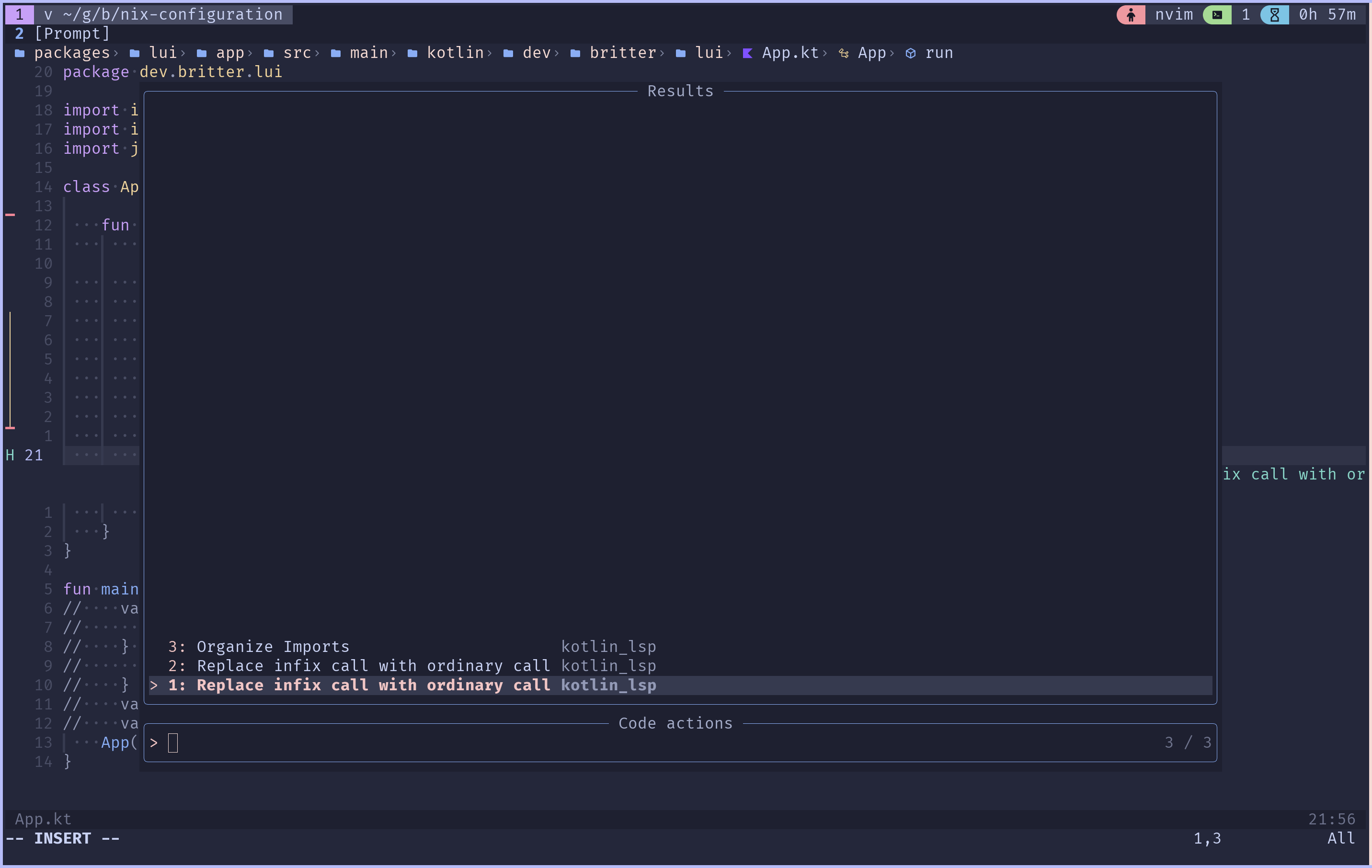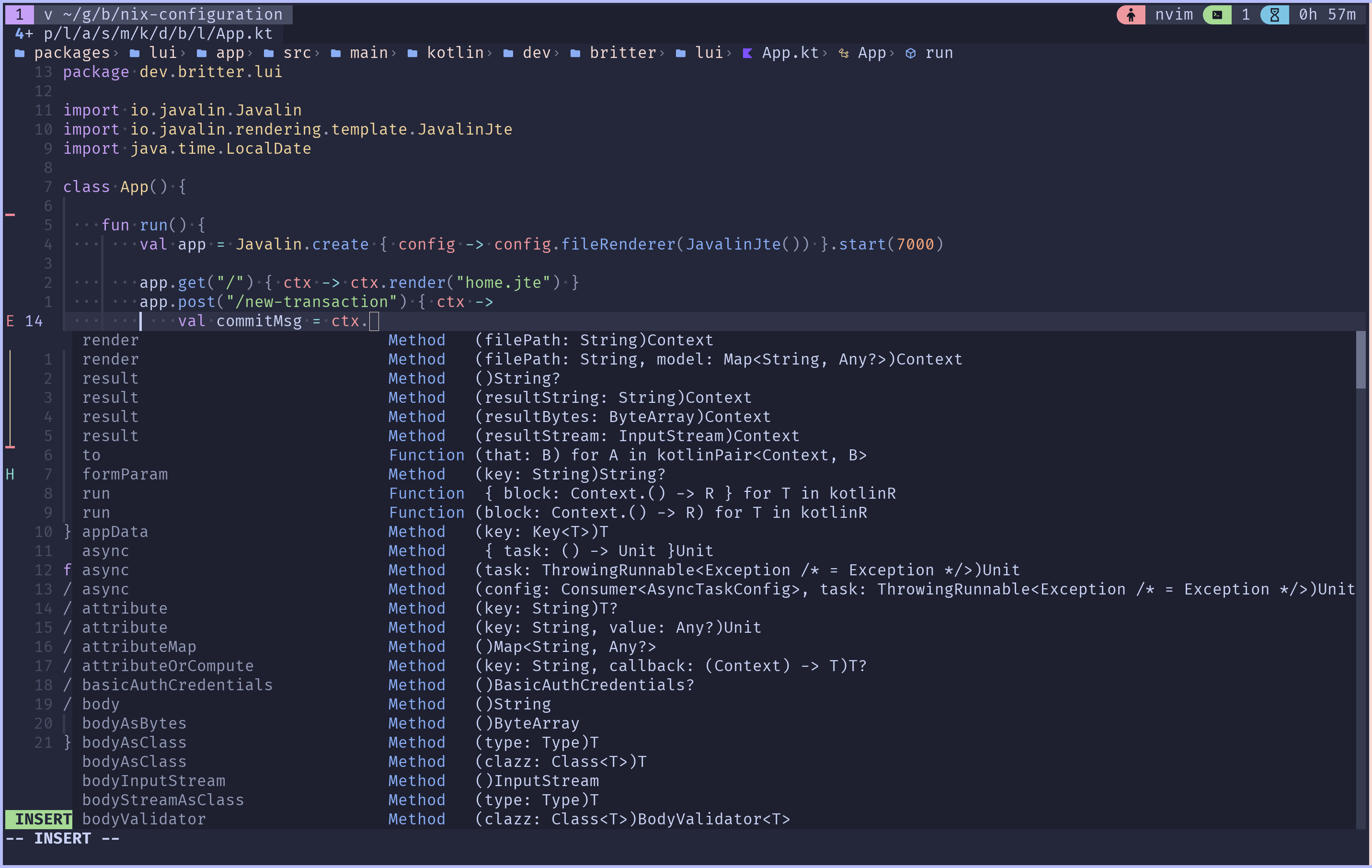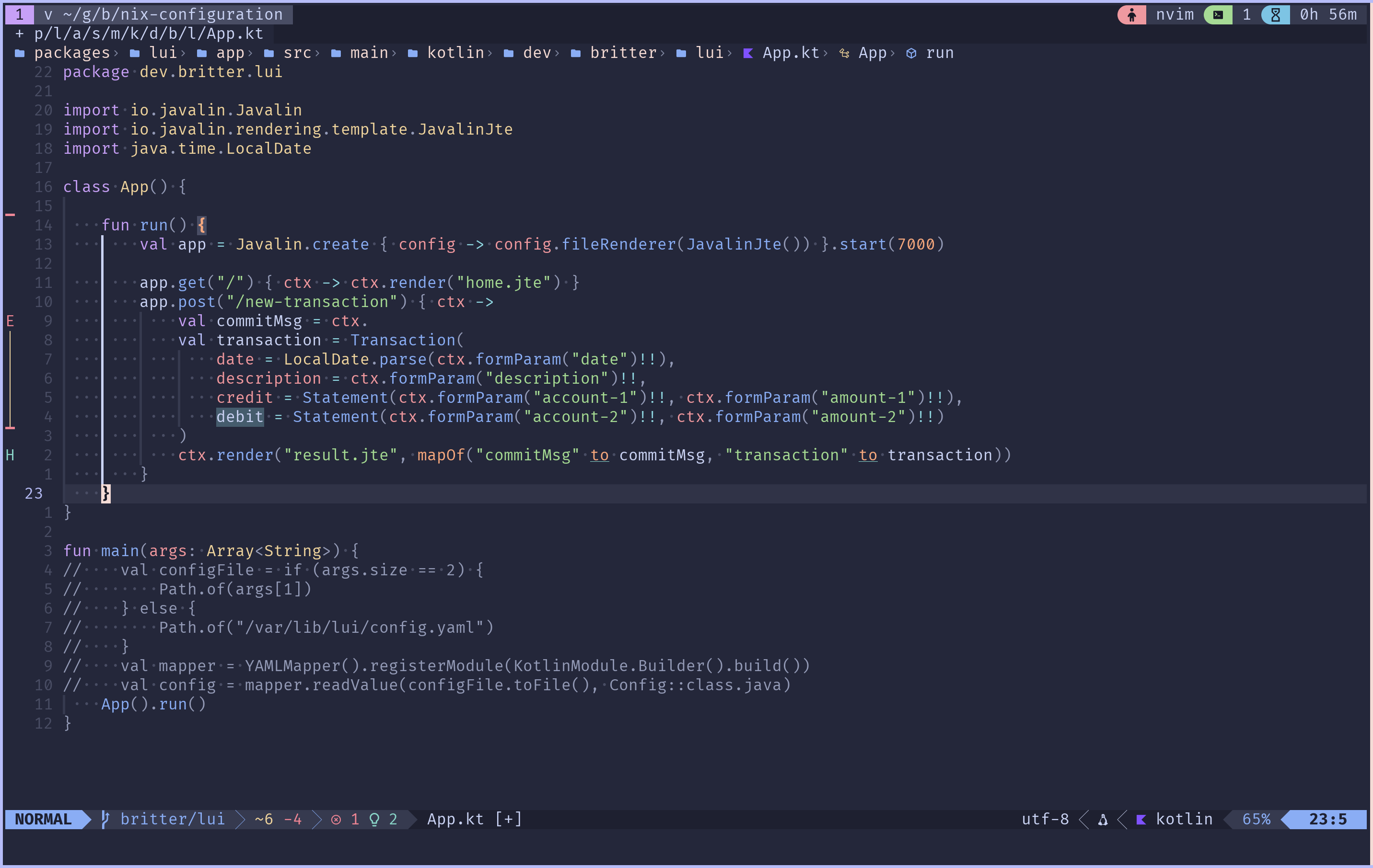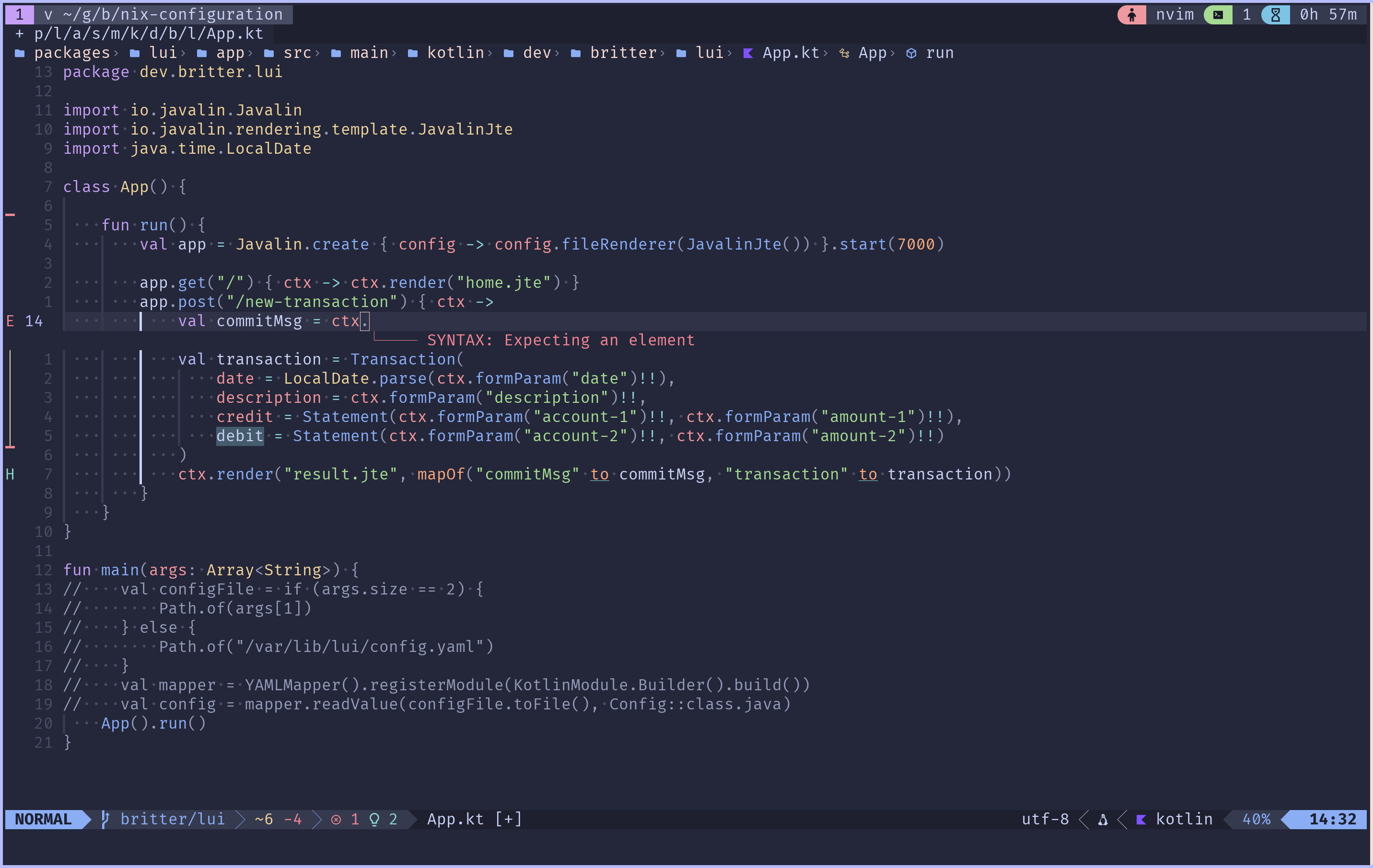 I recently started a small side project for my home lab and decided to implement it with Kotlin. My editor of choise has become Neovim over the past few months due to it’s flexibility and configurability, so naturally I wanted to have a nice experience while editing Kotlin code inside of Neovim. Since I manage my Neovim configuration using NixVim, this required packaging the kotlin-lsp to be able to use it in my NixVim configuration. In this blog post I’m going to explain how I did that in order to have a fully declarative setup of kotlin-lsp in Neovim.